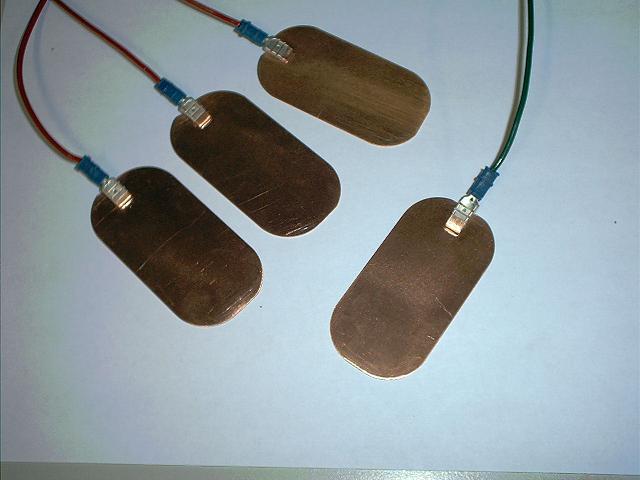 (Special application) Small Copper Zapping Pads 1-1/2 x 3 inches (includes wires) $44.00 US (set of 4 pads includes 1 green wire and a 3 red wire set). PZ00019 |